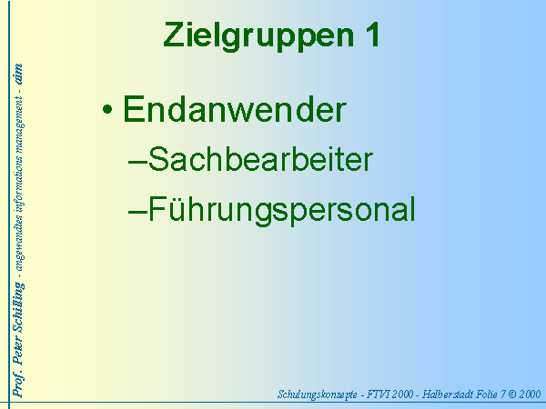 In diese Gruppe werden alle Personen zusammengefaßt, in deren Aufgabenbereich IT-Nutzung stattfindet, ohne daß sie vertiefte Informatikkenntnisse aufweisen (müßten). Ihr Interesse richtet sich auf die IT-Unterstützung für eine problemlose Aufgabenerledigung; d.h. ihre Erwartung an die Schulung konzentriert sich auf das “wie”. Hintergrundwissen wird eher als unnötiger Ballast abgelehnt.